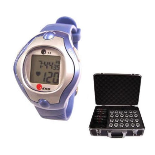 24 Calorie Counting EKHO E-15 Heart Rate Monitors AND 24 Extra Chest Straps, all in a Free Aluminum storage case. Use the E-15 for Walking, Jogging, Running, Aerobics, Cycling or General Exercise. Provides continuous heart rate reading, target zones settings with alarm. Calorie measurements based on personal date(weight, gender), stopwatch, time of day and calendar. 5 year warranty with user replaceable batteries on transmitter and watch.